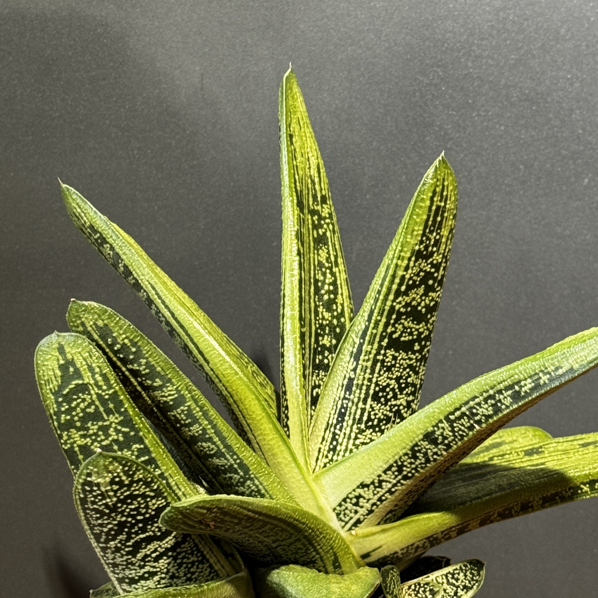Gasteria ‘Little Warty’ is a compact, slow-growing succulent loved for its thick, tongue-shaped leaves covered in tiny white bumps that give it a charming, textured look. Its deep green foliage and rosette form make it a perfect tabletop or windowsill plant, especially for small spaces.