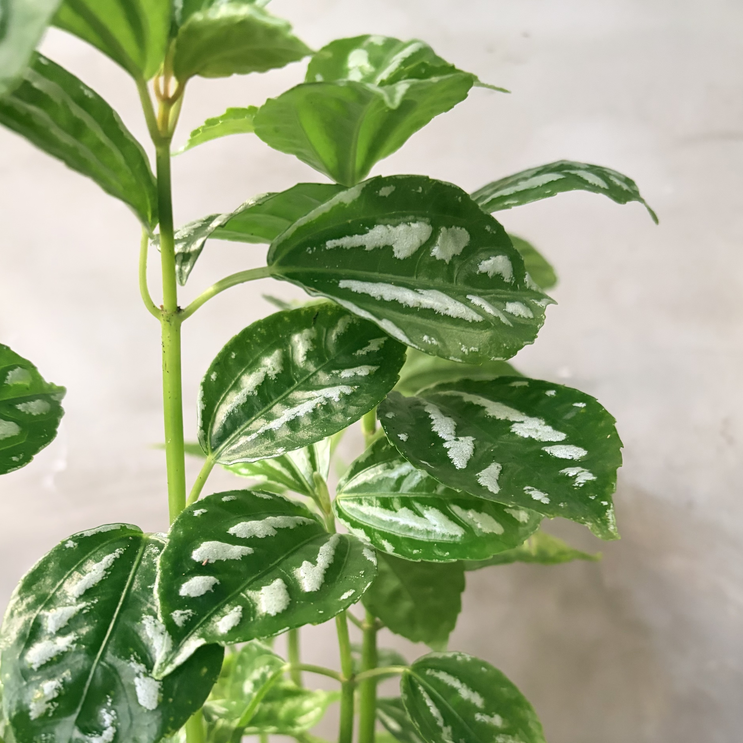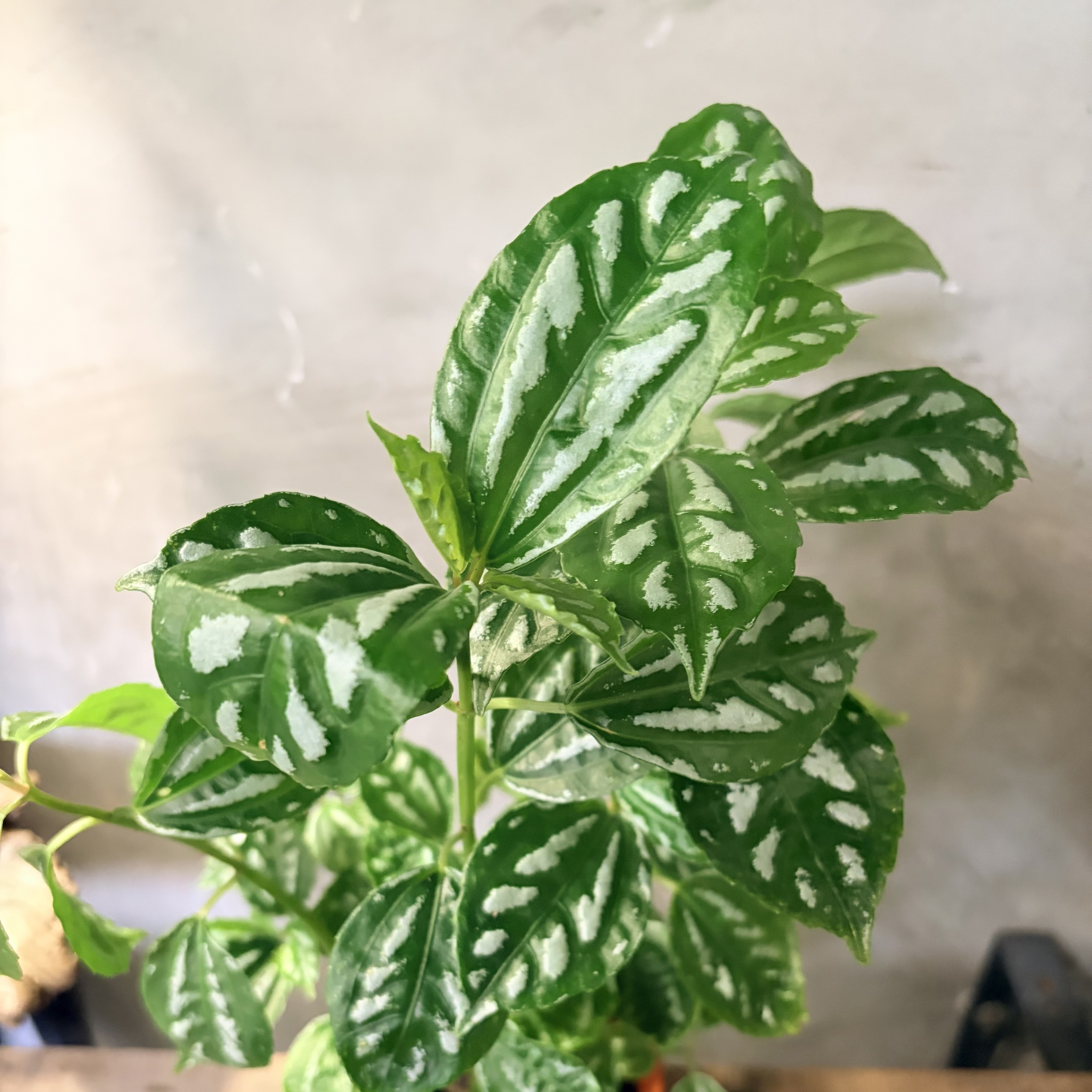 Pilea cadierei, commonly called the Aluminum Plant, is a striking indoor plant known for its glossy green leaves marked with bright silver patches. The metallic pattern gives it a unique, eye-catching look, making it a great choice for shelves, desks, and shaded corners. Its compact size and easy-care nature make it perfect for beginners.