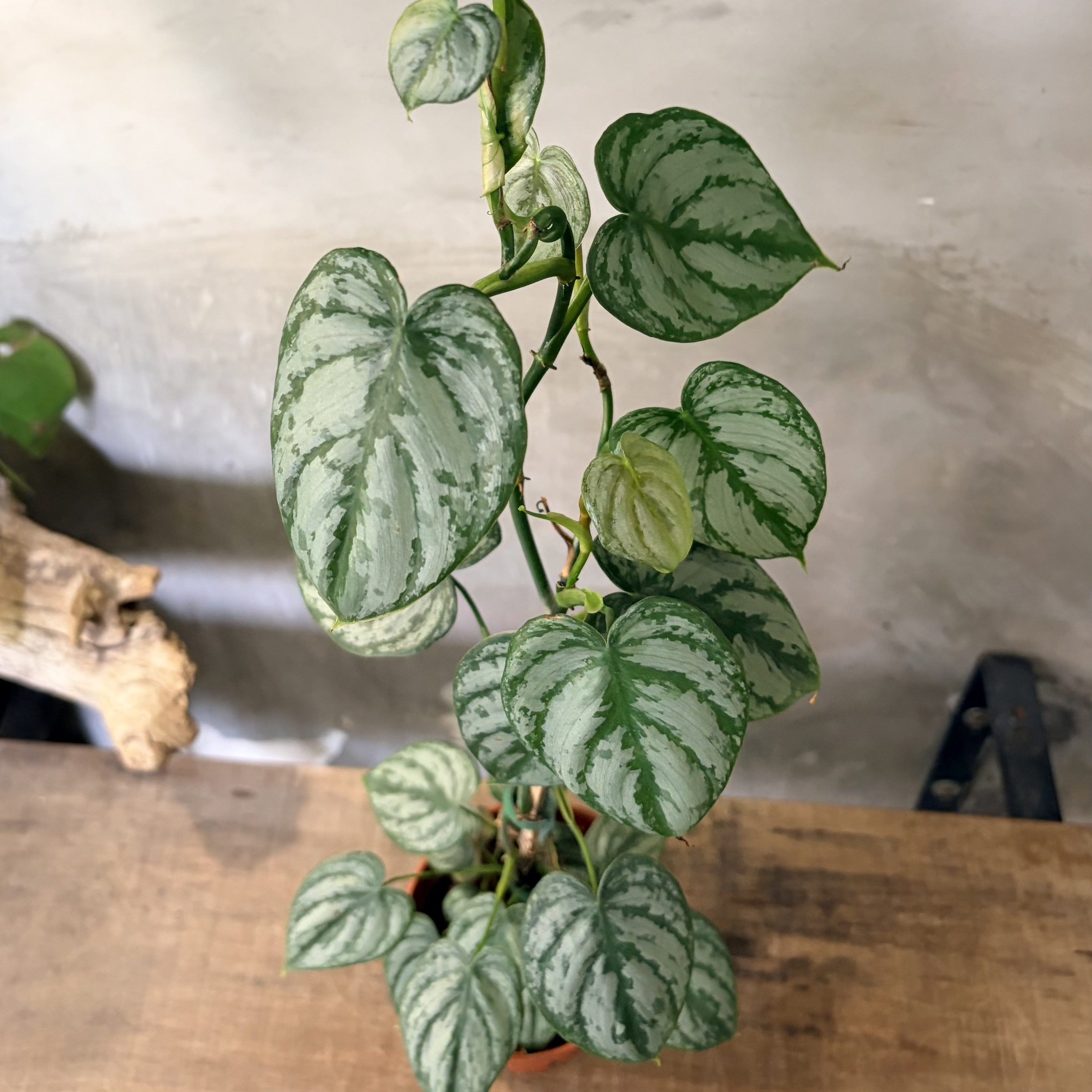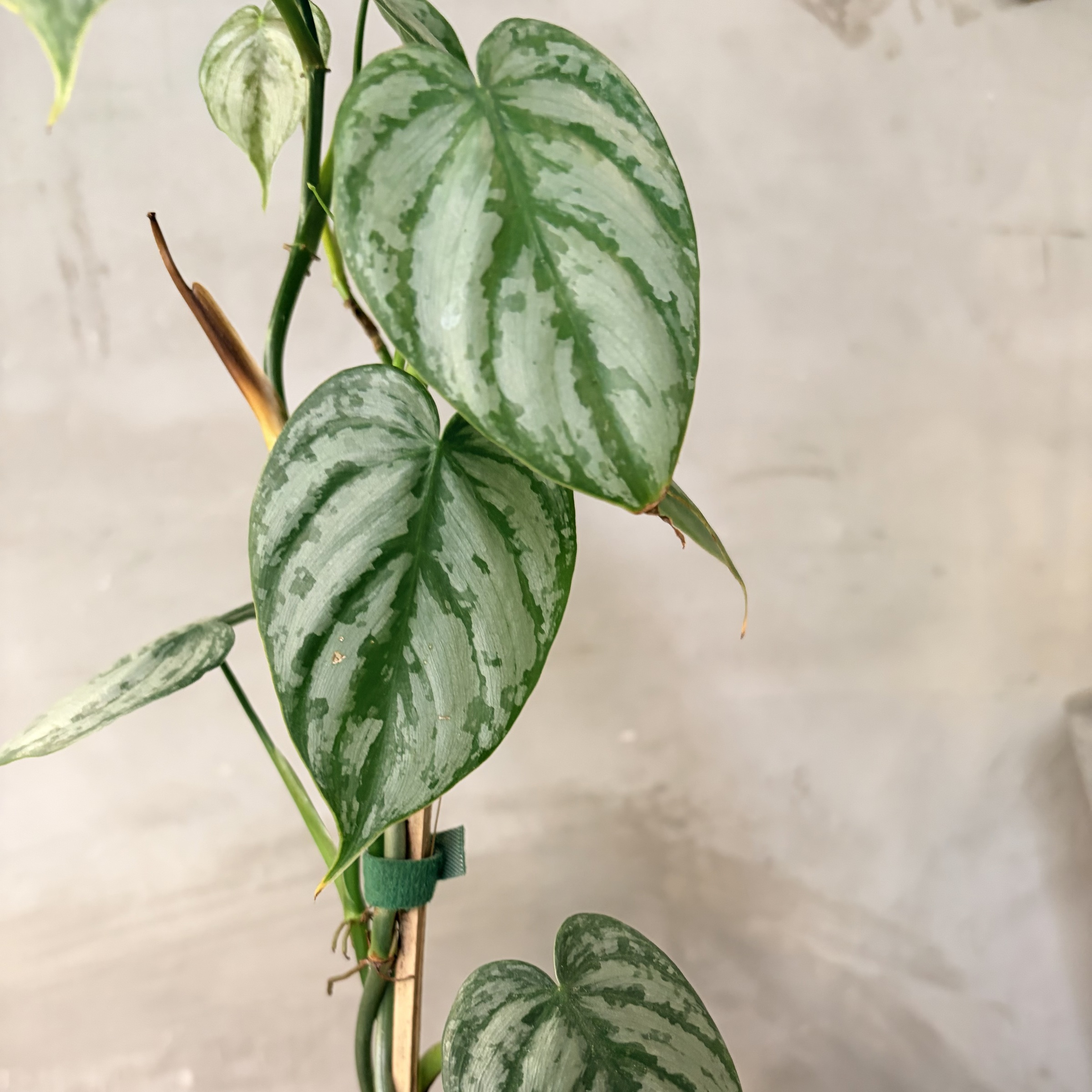 Philodendron brandtianum, also called the Silver Leaf Philodendron, is a beautiful climbing plant admired for its heart-shaped leaves with striking silver variegation against a green background. Its compact growth and trailing or climbing habit make it perfect for tabletops, hanging baskets, or trained on a moss pole.