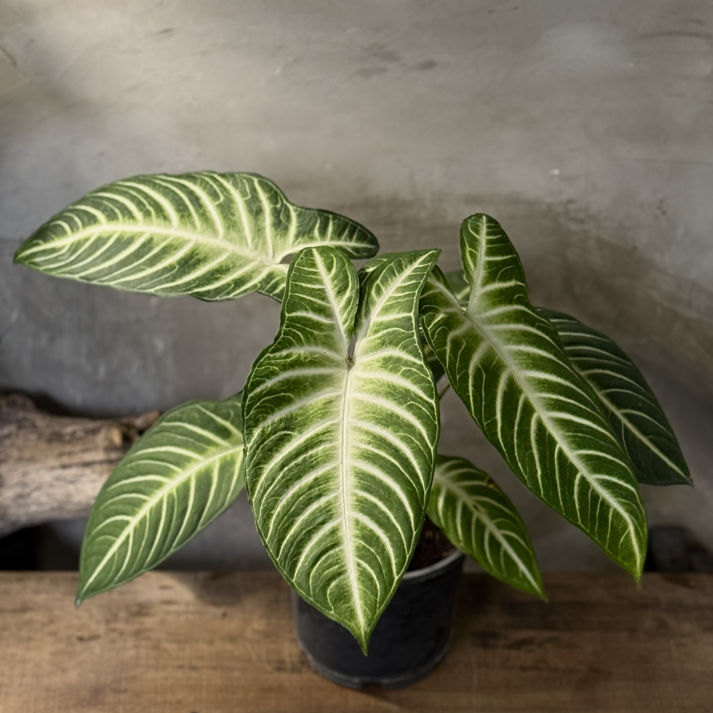 Xanthosoma lindenii, also known as Angel's Wing or Elephant Ear, is a stunning tropical plant appreciated for its large, arrow-shaped leaves marked with striking silver-white veins. This plant can grow up to 3-5 feet tall indoors, adding a dramatic flair to any space.